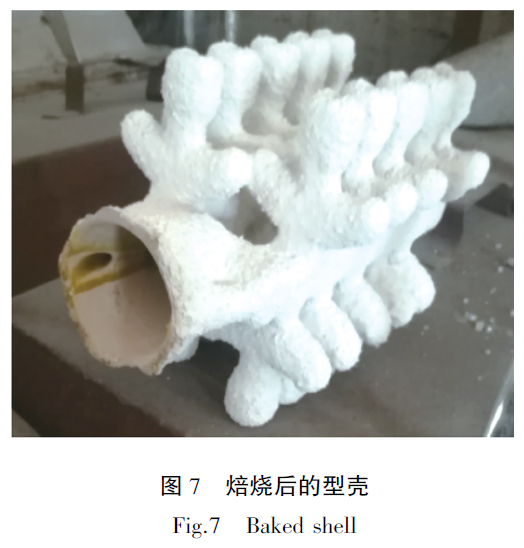 樹脂模在焙燒過程中容易發(fā)生膨脹脹裂型殼,本工藝樹脂模因其表面涂有蠟,預(yù)熱溫度60℃時(shí)蠟已經(jīng)開始融化,使模型與殼之間產(chǎn)生了間隙,徹底解決了因樹脂焙燒膨脹而對(duì)模殼產(chǎn)生的脹裂問題。樹脂模必須采用天然氣爐焙燒,樹脂在天然氣爐中瞬間燃燒消失減少了其因膨脹而對(duì)型殼損壞。圖6 為天然氣焙燒爐,圖7 為焙燒后的型殼。制好的的型殼組盤后即可澆注,澆注好的鑄件如果是重量輕、壁厚薄的鑄件其表面污染層薄,無需專門去除,經(jīng)過熱等靜壓、精整和包裝后即可發(fā)給客戶。