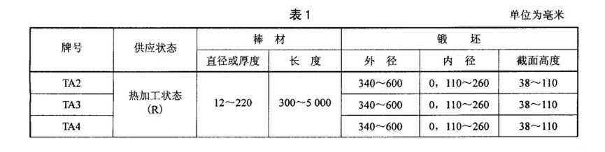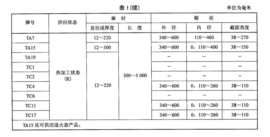 棒材和鍛坯牌號、狀態(tài)和規(guī)格應符合表1的規(guī)定。其中TA15鈦合金棒材根據(jù)用途分為兩個類別: