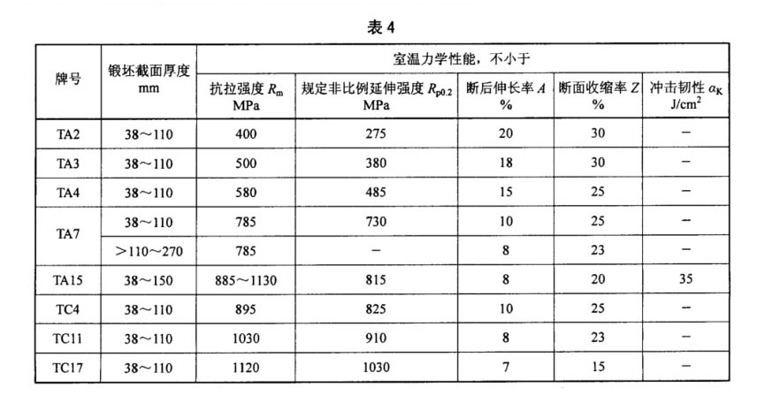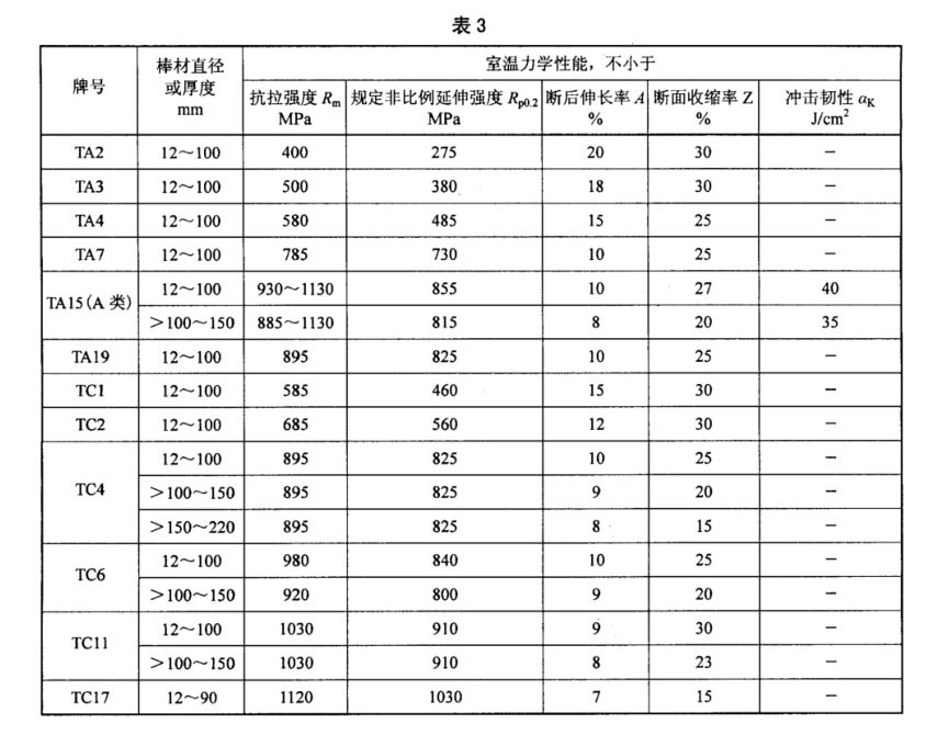 3.4.2 棒材的室溫力學性能應符合表3的規(guī)定,鍛坯的室溫力學性能應符合表4的規(guī)定,超出表中規(guī)格范圍的棒材或鍛坯的室溫力學性能由雙方協(xié)商確定。