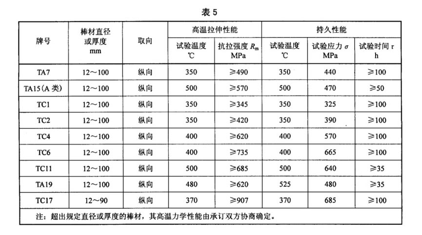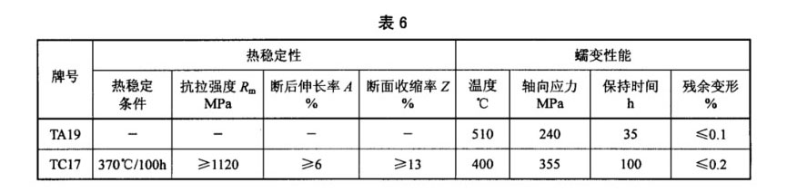 3.4.3 訂購方要求并在合同中注明時,鈦合金棒材的高溫拉伸、持久性能應符合表5的規(guī)定,TA19和TC17鈦合金棒材的熱穩(wěn)定性和高溫蠕變性能應符合表6的規(guī)定。