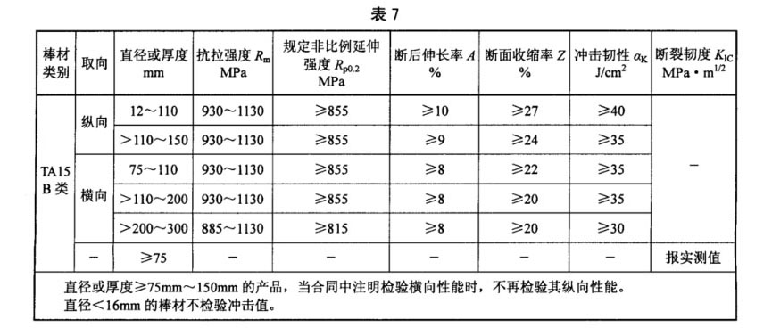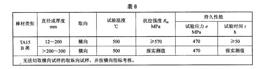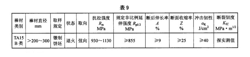 3.4.4 B類用途的TA15鈦合金棒材,其室溫力學性能在退火態(tài)棒材上或經(jīng)熱處理后的棒坯(一段棒材)上取樣測試。其室溫力學性能應符合表7的規(guī)定,高溫力學性能應符合表8的規(guī)定;當訂購方要求并在合同中注明時,直徑大于200mm的棒材應取樣鐓制餅坯,餅坯的室溫力學性能應符合表9的規(guī)定。