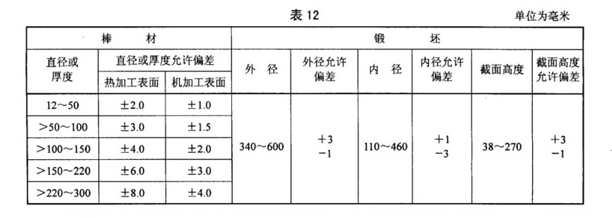 3.7.1 棒材和鍛坯以磨削或機加工表面供貨。當訂購方要求并在合同中注明時,棒材也可以熱加工表面供貨。棒材和鍛坯的尺寸允許偏差應符合表12的規(guī)定。