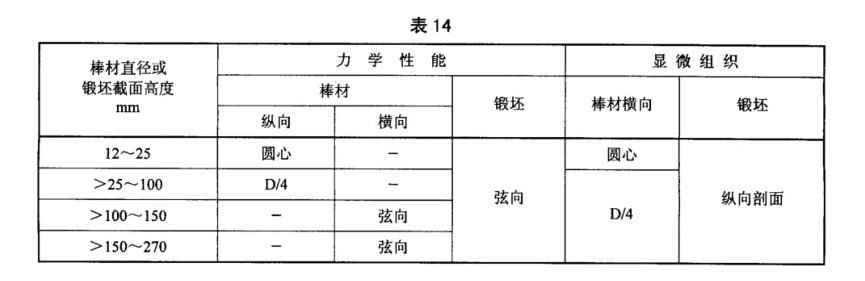 毛坯加熱到β相變溫度以下20℃~40℃, 保溫30min, 在鍛錘或壓力機上一火鐓粗至高度為24mm±3mm的餅坯,然后按3.3.1條推薦的制度進行熱處理。敏粗餅坯一半由承制方進行試驗,另一半與該批棒材一起提交訂購方。餅坯按表14規(guī)定的取樣數(shù)量進行室溫力學性能和斷裂韌度試驗,取樣位置為餅坯厚度中心處的D/2~D/4之間的弦向。