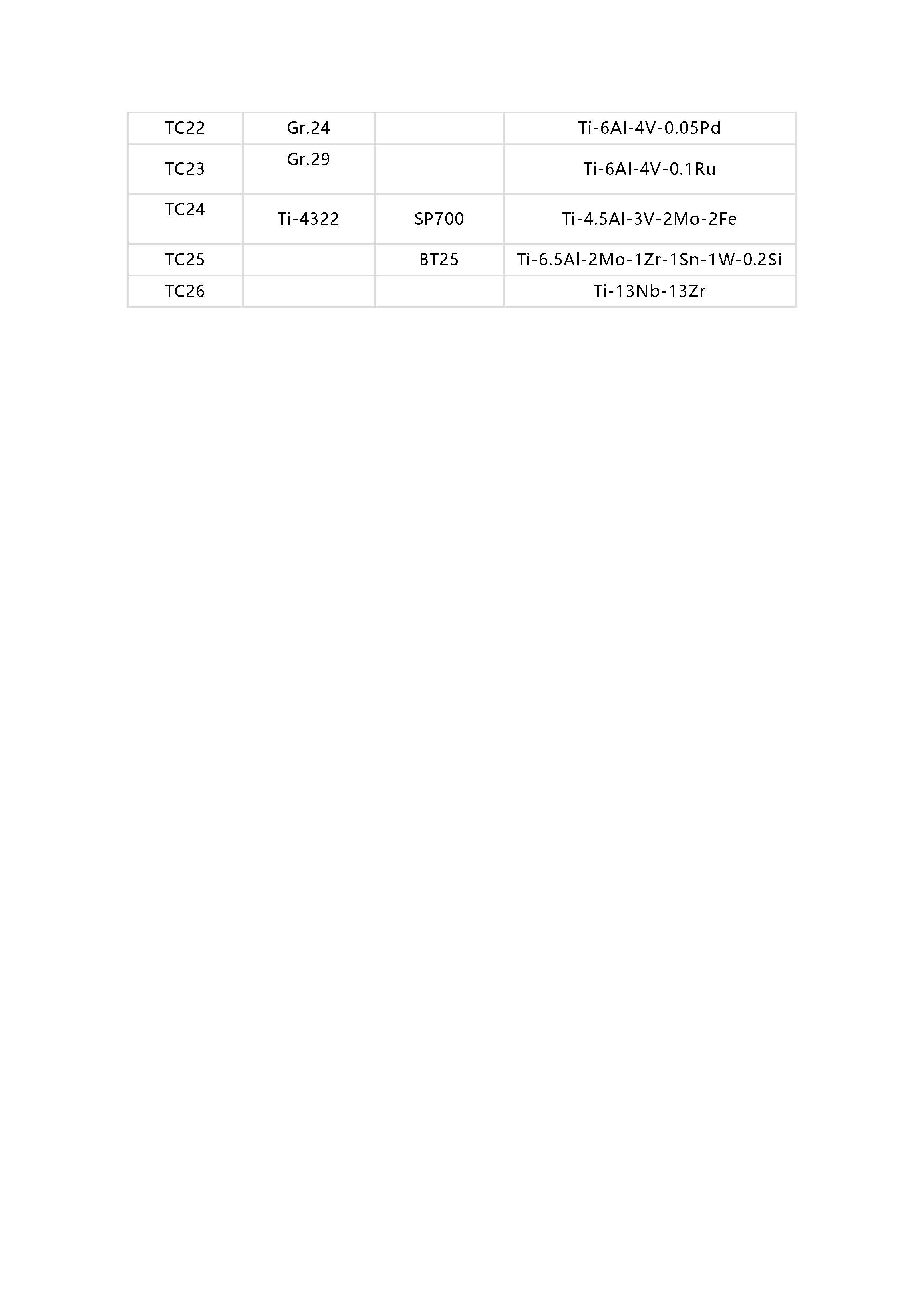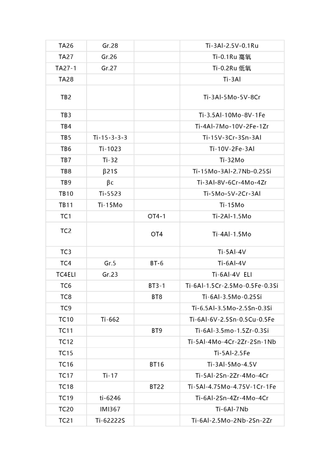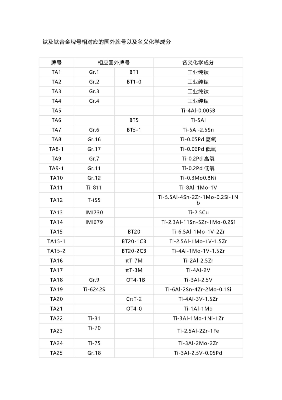 鈦及鈦合金牌號相對應(yīng)的國外牌號以及名義化學(xué)成分